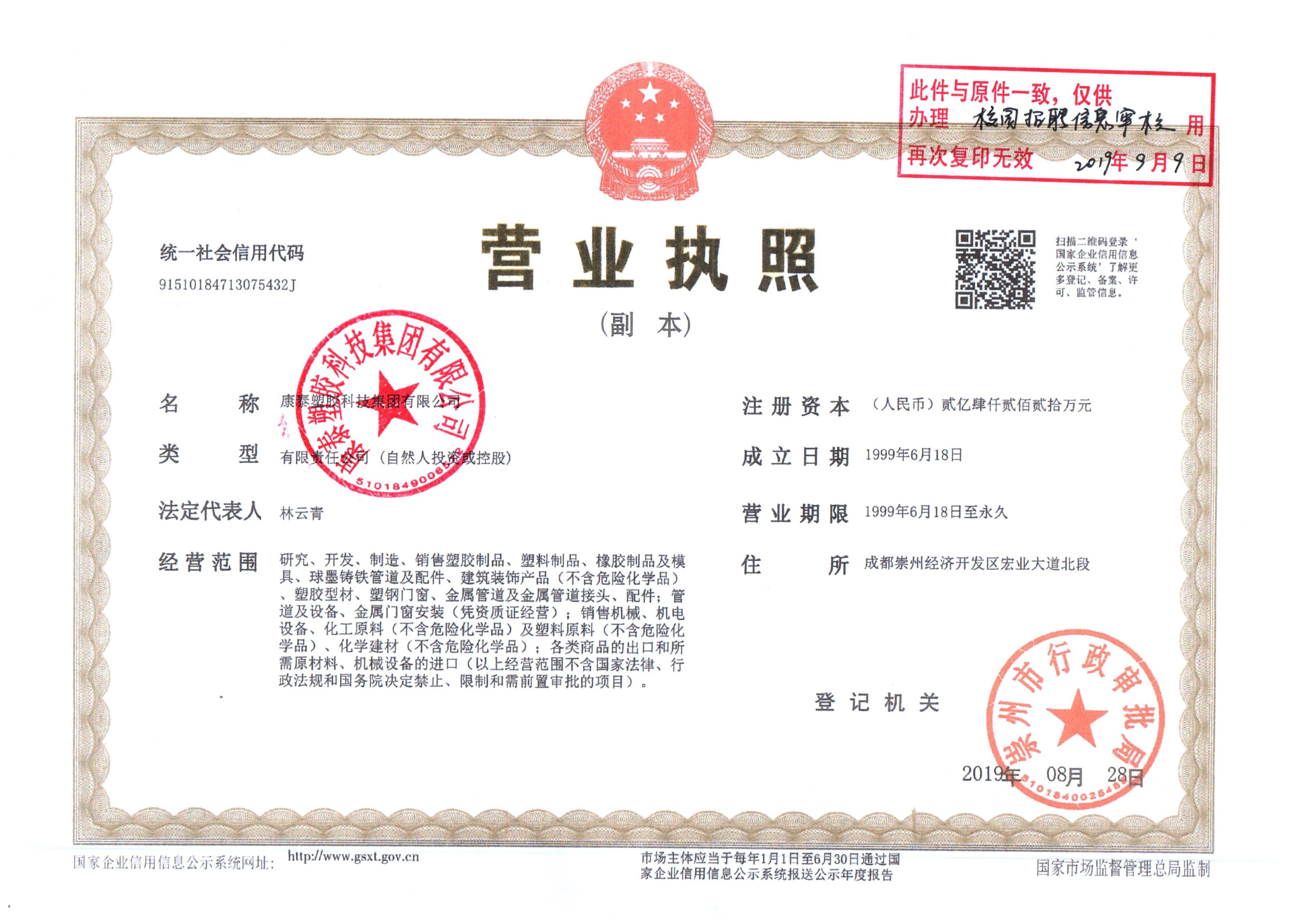 康泰塑膠科技集團有限公司創(chuàng)立于1999年,總部坐落于美麗的中國崇州。是一家集專業(yè)研發(fā)、制造、銷售為一體的大型塑膠建材現代化集團企業(yè)。集團先后組建了成都康泰、浙江康泰、河南康泰、河北康泰、遼寧康泰、廣東康泰6家成員企業(yè)。公司注冊資本2.422億元,擁有國際先進水平的專用生產設備1000余臺套,員工2000余名,總資產近20億,年產能80萬噸以上,是建設部發(fā)布的中國最具規(guī)模的化學建材生產基地之一。