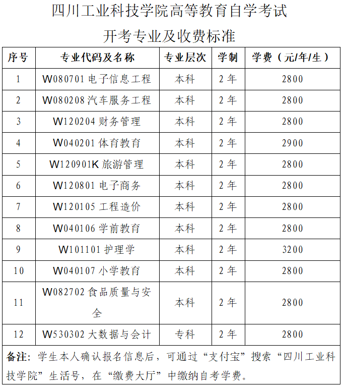 四川工業(yè)科技學(xué)院高等教育自學(xué)考試開(kāi)考專業(yè)及收費(fèi)標(biāo)準(zhǔn)