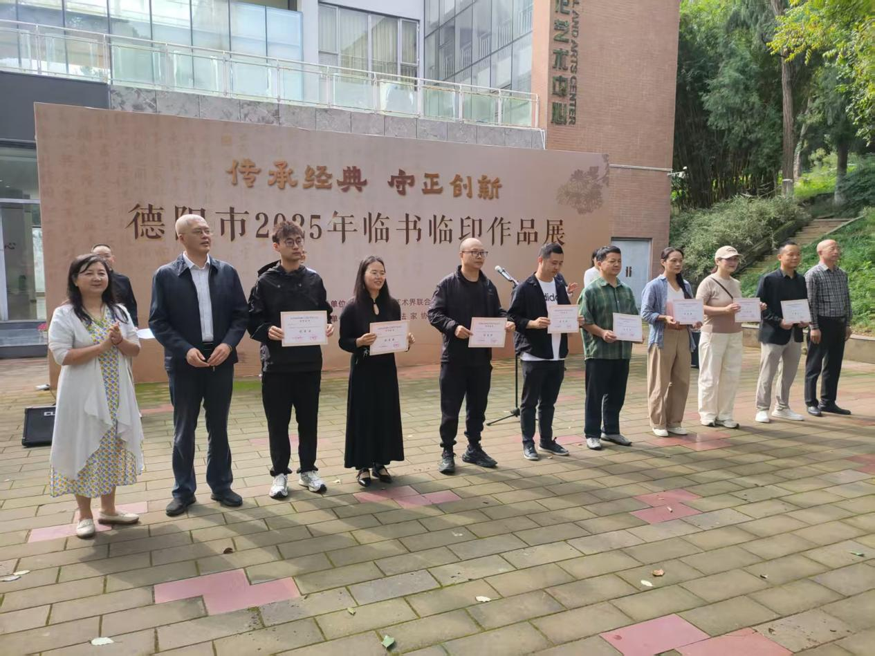 10月9日,由德陽市文學藝術界聯(lián)合會指導、德陽市書法家協(xié)會主辦的2025年“傳承經(jīng)典·守正創(chuàng)新”臨書臨印作品展順利舉行。學校教育學院技能教研室尹茜老師在本次展覽中榮獲佳績,并作為獲獎作者代表發(fā)言。