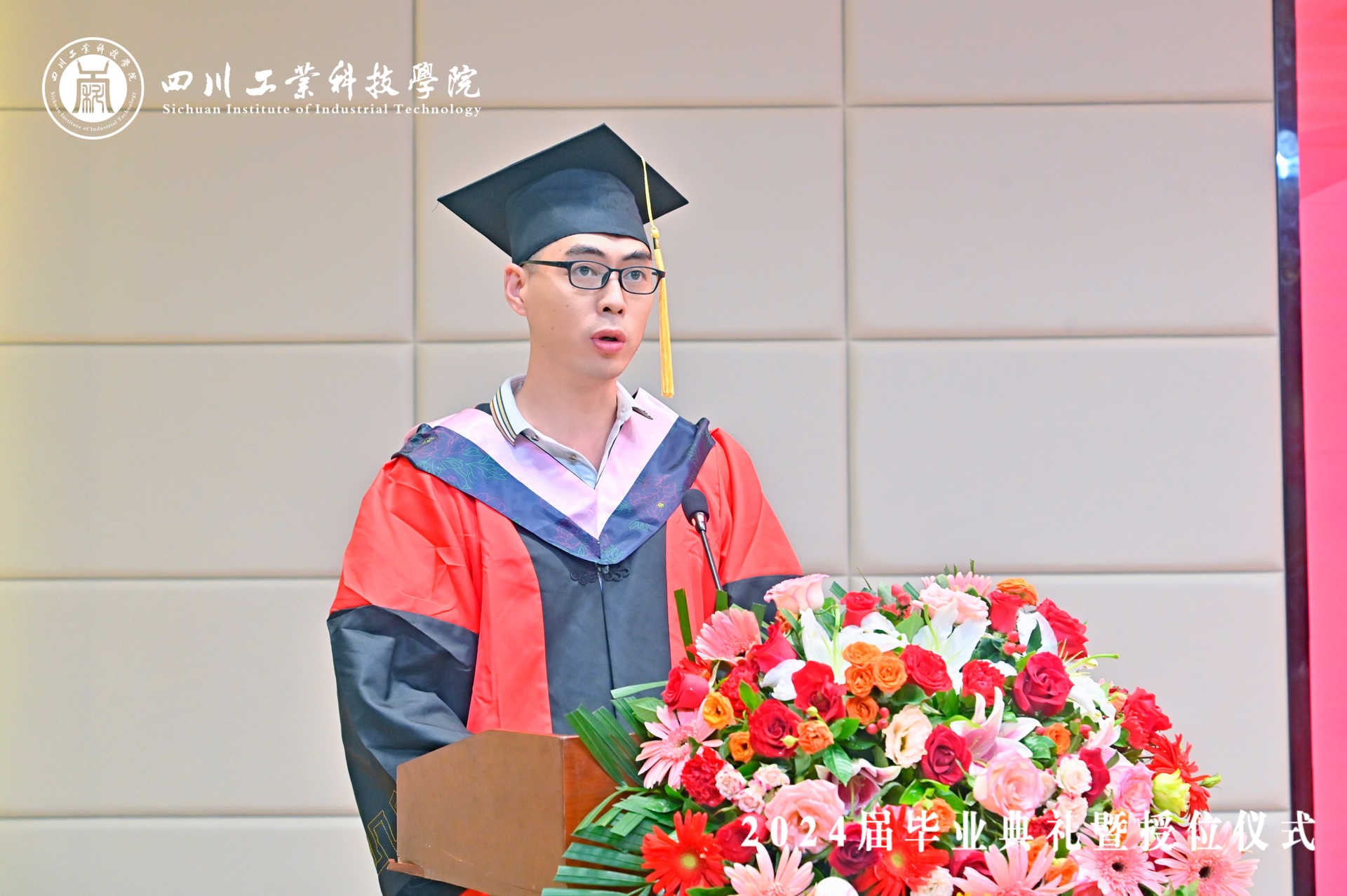 會議第七項(xiàng),優(yōu)秀畢業(yè)生代表譚境賢發(fā)言。她談到:“畢業(yè)也意味著我們學(xué)生時代的終結(jié),但并不意味著學(xué)習(xí)生涯的結(jié)束,未來我們要在生活中學(xué)習(xí),在學(xué)習(xí)中生活。讓時間作證,我們2024屆全體畢業(yè)生,一定會牢記“明德、博學(xué)、篤行、創(chuàng)新”的校訓(xùn),做尚德之人、有德之人、施德之人,做學(xué)識淵博之人,做不懈追求和捍衛(wèi)客觀真理之人,做敢于擔(dān)當(dāng)、敢為人先、勇于創(chuàng)新之人。”