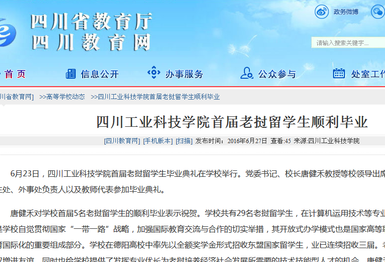 6月23日,四川工業(yè)科技學(xué)院首屆老撾留學(xué)生畢業(yè)典禮在學(xué)校舉行。黨委書記、校長(zhǎng)唐健禾教授等校領(lǐng)導(dǎo)出席畢業(yè)典禮,教務(wù)處、學(xué)生處、外事處負(fù)責(zé)人以及教師代表參加畢業(yè)典禮。