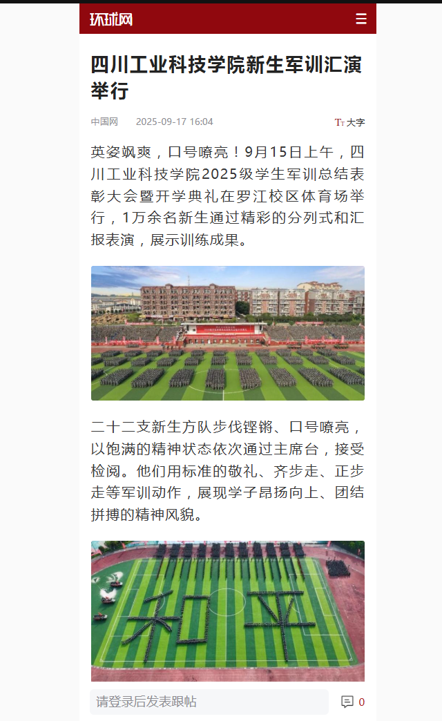 英姿颯爽,口號(hào)嘹亮!9月15日上午,四川工業(yè)科技學(xué)院2025級(jí)學(xué)生軍訓(xùn)總結(jié)表彰大會(huì)暨開(kāi)學(xué)典禮在羅江校區(qū)體育場(chǎng)舉行,1萬(wàn)余名新生通過(guò)精彩的分列式和匯報(bào)表演,展示訓(xùn)練成果。