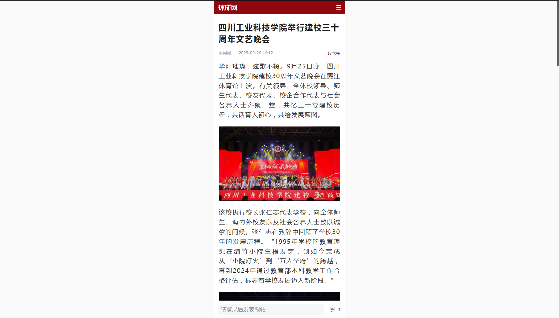 華燈璀璨,弦歌不輟。9月25日晚,四川工業(yè)科技學(xué)院建校30周年文藝晚會(huì)在龑江體育館上演。有關(guān)領(lǐng)導(dǎo)、全體校領(lǐng)導(dǎo)、師生代表、校友代表、校企合作代表與社會(huì)各界人士齊聚一堂,共憶三十載建校歷程,共話育人初心,共繪發(fā)展藍(lán)圖。