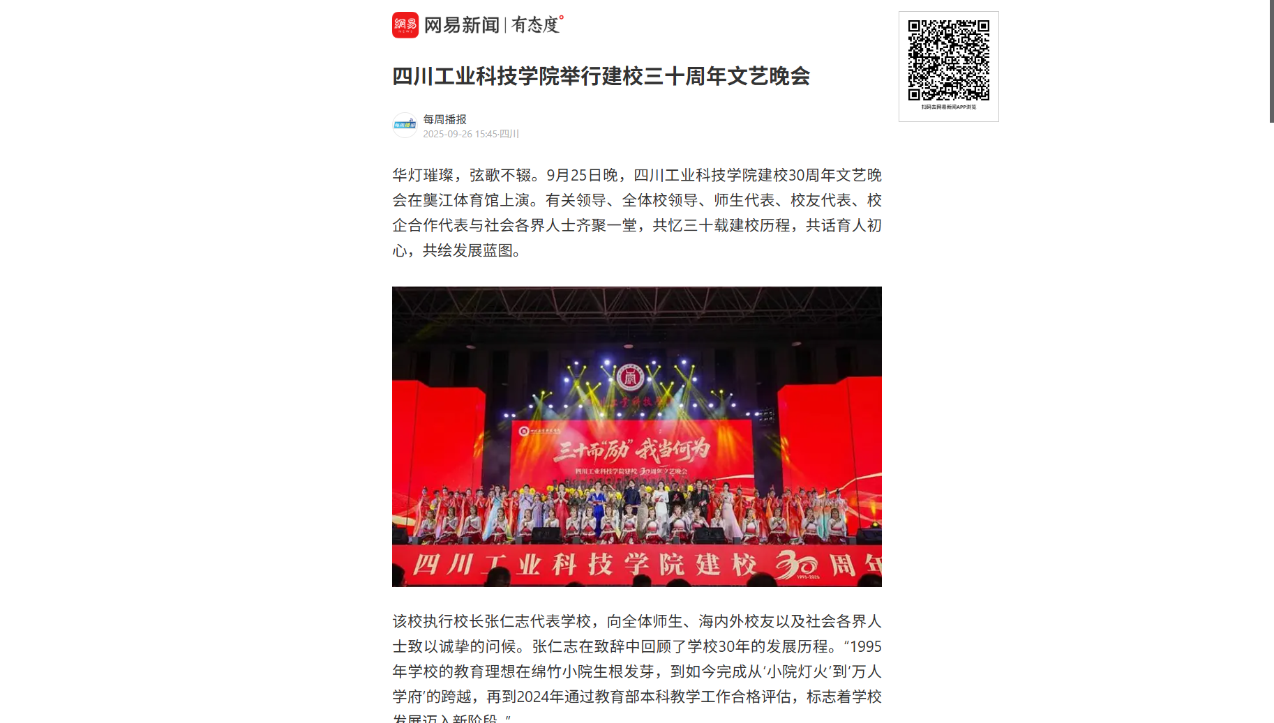 華燈璀璨,弦歌不輟。9月25日晚,四川工業(yè)科技學院建校30周年文藝晚會在龑江體育館上演。有關領導、全體校領導、師生代表、校友代表、校企合作代表與社會各界人士齊聚一堂,共憶三十載建校歷程,共話育人初心,共繪發(fā)展藍圖。