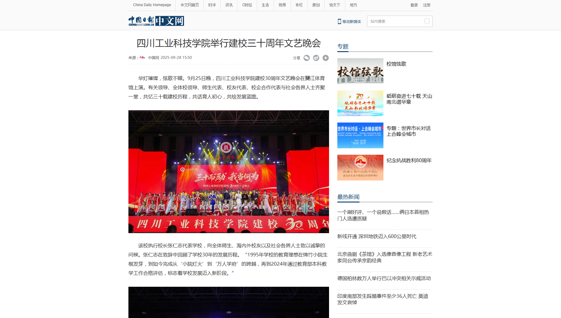 華燈璀璨,弦歌不輟。9月25日晚,四川工業(yè)科技學(xué)院建校30周年文藝晚會(huì)在龑江體育館上演。有關(guān)領(lǐng)導(dǎo)、全體校領(lǐng)導(dǎo)、師生代表、校友代表、校企合作代表與社會(huì)各界人士齊聚一堂,共憶三十載建校歷程,共話育人初心,共繪發(fā)展藍(lán)圖。