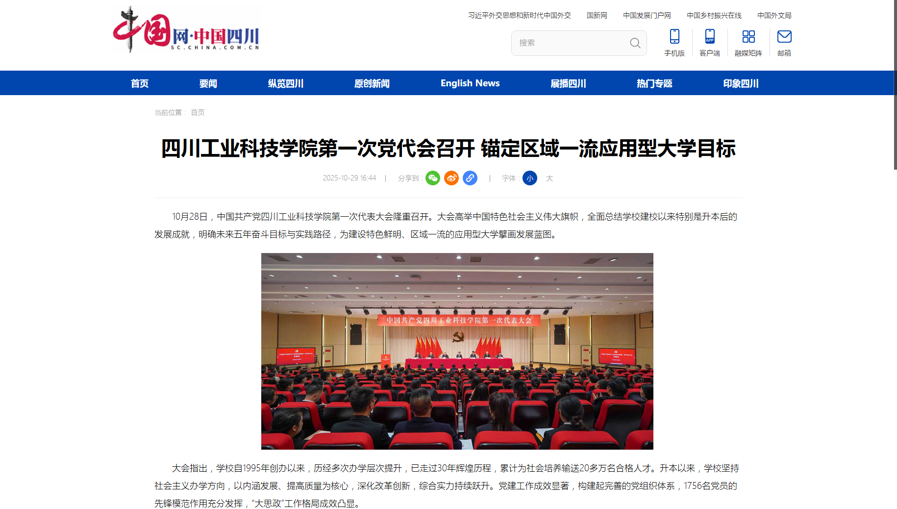 10月28日,中國共產(chǎn)黨四川工業(yè)科技學(xué)院第一次代表大會(huì)隆重召開。大會(huì)高舉中國特色社會(huì)主義偉大旗幟,全面總結(jié)學(xué)校建校以來特別是升本后的發(fā)展成就,明確未來五年奮斗目標(biāo)與實(shí)踐路徑,為建設(shè)特色鮮明、區(qū)域一流的應(yīng)用型大學(xué)擘畫發(fā)展藍(lán)圖。