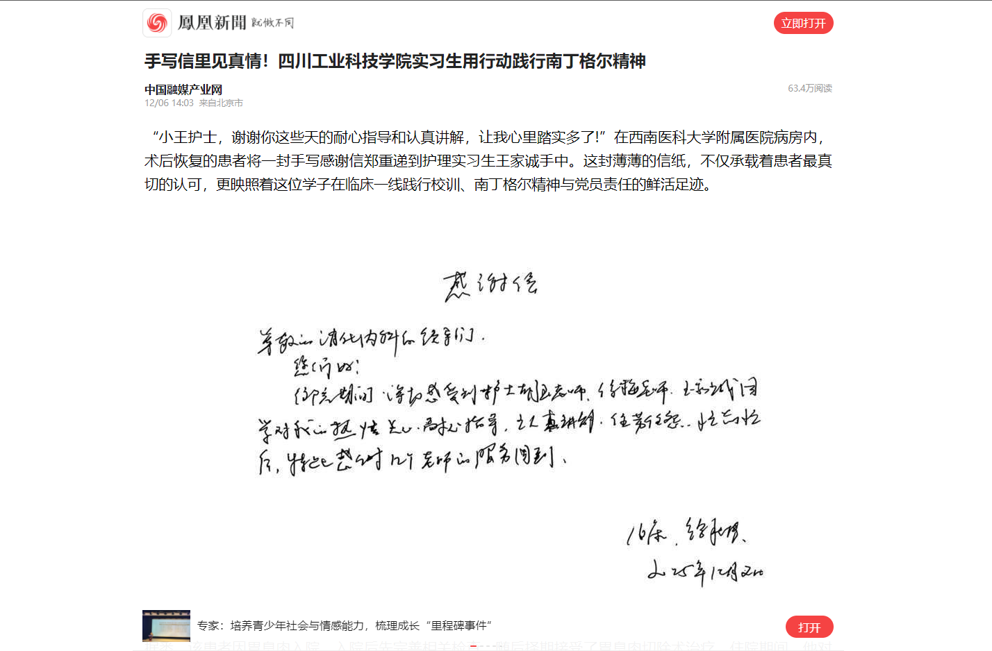 “小王護(hù)士,謝謝你這些天的耐心指導(dǎo)和認(rèn)真講解,讓我心里踏實(shí)多了!”在西南醫(yī)科大學(xué)附屬醫(yī)院病房內(nèi),術(shù)后恢復(fù)的患者將一封手寫感謝信鄭重遞到護(hù)理實(shí)習(xí)生王家誠手中。這封薄薄的信紙,不僅承載著患者最真切的認(rèn)可,更映照著這位學(xué)子在臨床一線踐行校訓(xùn)、南丁格爾精神與黨員責(zé)任的鮮活足跡。