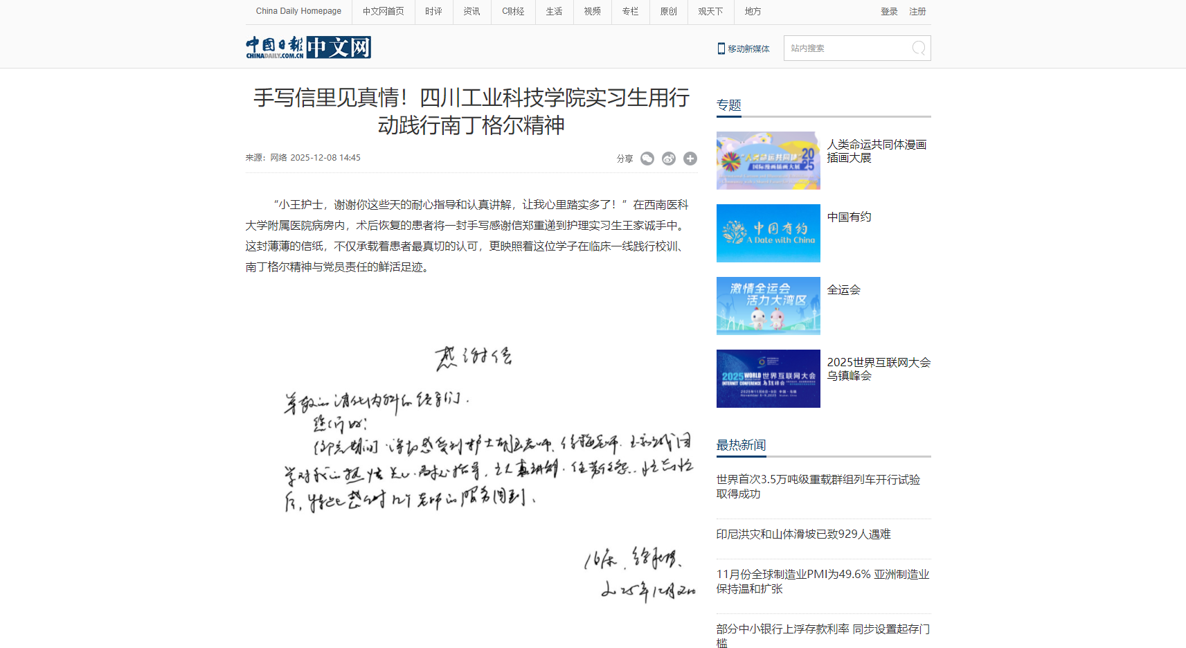 “小王護(hù)士,謝謝你這些天的耐心指導(dǎo)和認(rèn)真講解,讓我心里踏實多了!”在西南醫(yī)科大學(xué)附屬醫(yī)院病房內(nèi),術(shù)后恢復(fù)的患者將一封手寫感謝信鄭重遞到護(hù)理實習(xí)生王家誠手中。這封薄薄的信紙,不僅承載著患者最真切的認(rèn)可,更映照著這位學(xué)子在臨床一線踐行校訓(xùn)、南丁格爾精神與黨員責(zé)任的鮮活足跡。