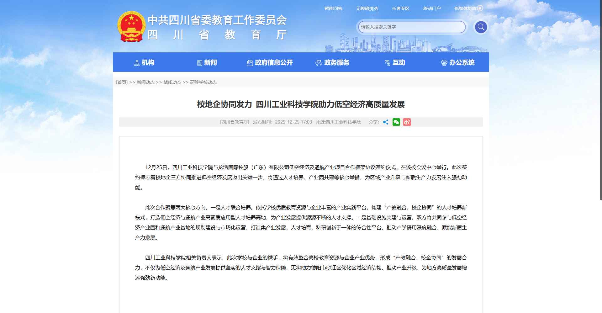 12月25日,四川工業(yè)科技學(xué)院與龍浩國(guó)際控股(廣東)有限公司低空經(jīng)濟(jì)及通航產(chǎn)業(yè)項(xiàng)目合作框架協(xié)議簽約儀式,在該校會(huì)議中心舉行。此次簽約標(biāo)志著校地企三方協(xié)同推進(jìn)低空經(jīng)濟(jì)發(fā)展邁出關(guān)鍵一步,將通過(guò)人才培養(yǎng)、產(chǎn)業(yè)園共建等核心舉措,為區(qū)域產(chǎn)業(yè)升級(jí)與新質(zhì)生產(chǎn)力發(fā)展注入強(qiáng)勁動(dòng)能。