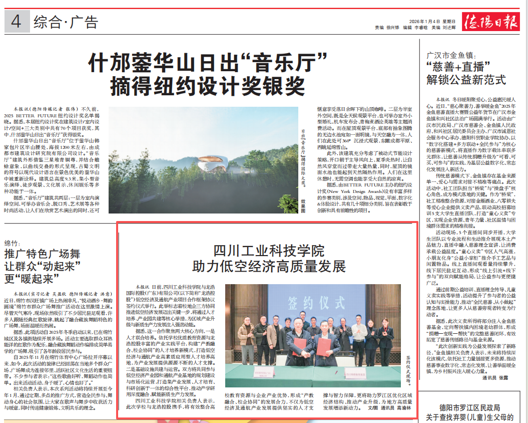 日前,四川工業(yè)科技學(xué)院與龍浩國際控股(廣東)有限公司(以下簡稱“龍浩控股”)低空經(jīng)濟及通航產(chǎn)業(yè)項目合作框架協(xié)議簽約儀式舉行。此舉標志著校地企三方協(xié)同推進低空經(jīng)濟發(fā)展邁出關(guān)鍵一步,將通過人才培養(yǎng)、產(chǎn)業(yè)園共建等核心舉措,為區(qū)域產(chǎn)業(yè)升級與新質(zhì)生產(chǎn)力發(fā)展注入強勁動能。 據(jù)悉,這一合作聚焦兩大核心方向,一是人才聯(lián)合培養(yǎng)。依托學(xué)校優(yōu)質(zhì)教育資源與龍浩控股豐富的產(chǎn)業(yè)實踐平臺,構(gòu)建“產(chǎn)教融合、校企協(xié)同”的人才培養(yǎng)新模式,打造低空經(jīng)濟與通航產(chǎn)業(yè)高素質(zhì)應(yīng)用型人才培養(yǎng)高地,為產(chǎn)業(yè)發(fā)展提供源源不斷的人才支撐。二是基礎(chǔ)設(shè)施共建與運營。雙方將共同參與低空經(jīng)濟產(chǎn)業(yè)園和通航產(chǎn)業(yè)基地的規(guī)劃建設(shè)與市場化運營,打造集產(chǎn)業(yè)發(fā)展、人才培育、科研創(chuàng)新于一體的綜合性平臺,推動產(chǎn)學(xué)研用深度融合,賦能新質(zhì)生產(chǎn)力發(fā)展。四川工業(yè)科技學(xué)院相關(guān)負責人表示,此次學(xué)校與龍浩控股攜手,將有效整合高校教育資源與企業(yè)產(chǎn)業(yè)優(yōu)勢,形成“產(chǎn)教融合、校企協(xié)同”的發(fā)展合力,不僅為低空經(jīng)濟及通航產(chǎn)業(yè)發(fā)展提供堅實的人才支撐與智力保障,更將助力羅江區(qū)優(yōu)化區(qū)域經(jīng)濟結(jié)構(gòu)、推動產(chǎn)業(yè)升級,為地方高質(zhì)量發(fā)展增添新動力。