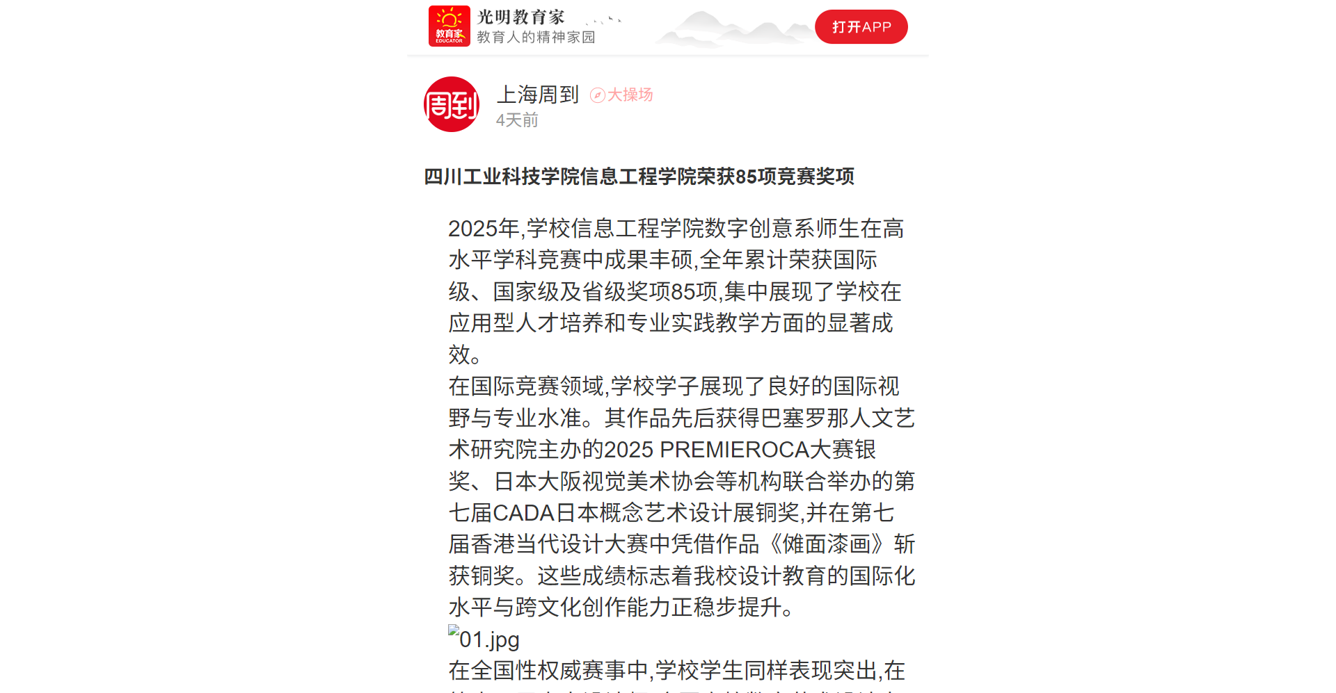 在省級競賽層面,學校學子廣泛參與并取得優(yōu)異成績,于四川省大學生廣告藝術(shù)大賽、民族工藝美術(shù)創(chuàng)意設計大賽、環(huán)境設計大賽、鄉(xiāng)村振興創(chuàng)意設計大賽等各類專業(yè)賽事中榮獲多項高級別獎項,展現(xiàn)了學校在服務地方文化建設、推動創(chuàng)意設計成果轉(zhuǎn)化方面的積極貢獻。