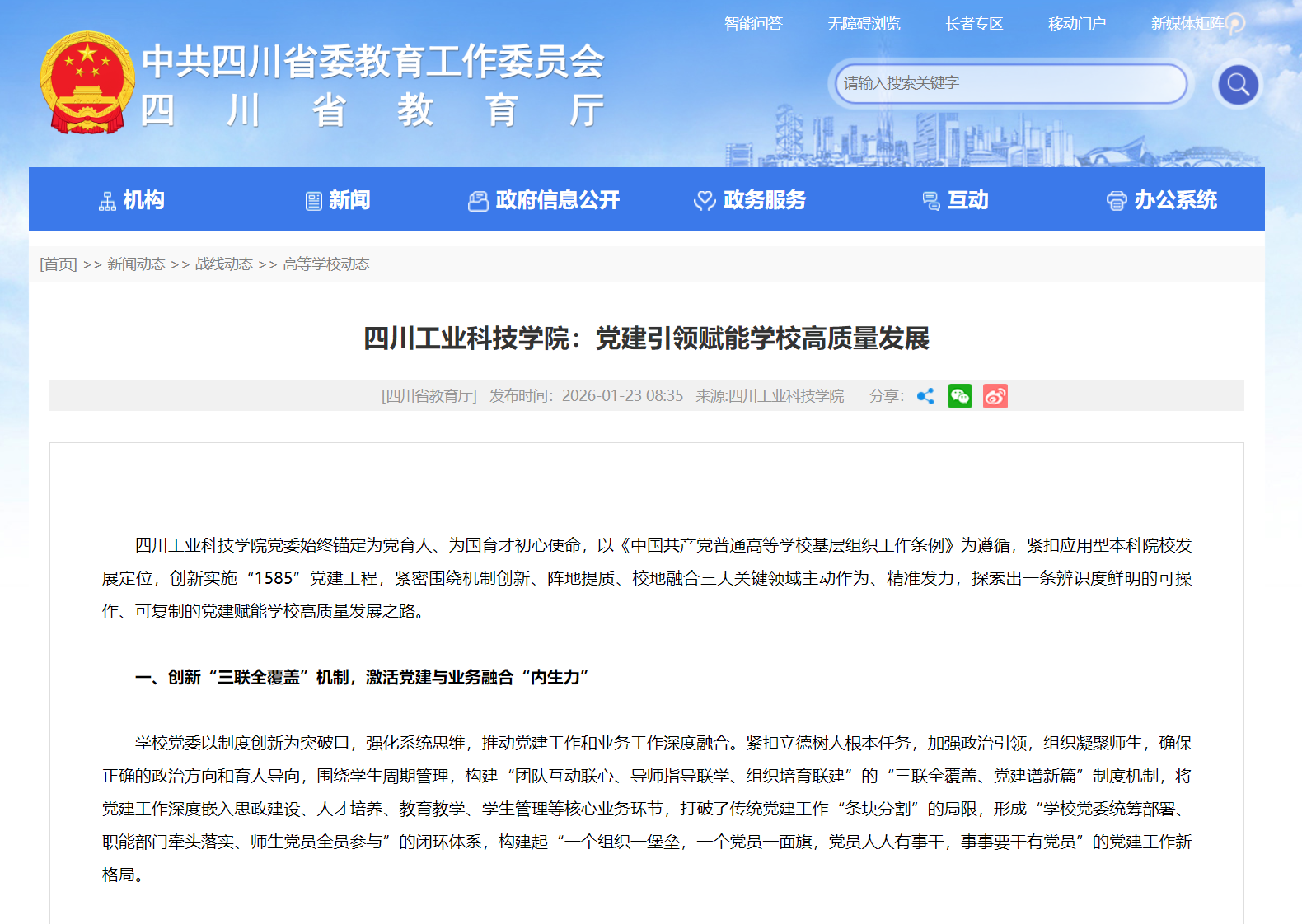 四川工業(yè)科技學(xué)院黨委始終錨定為黨育人、為國(guó)育才初心使命,以《中國(guó)共產(chǎn)黨普通高等學(xué)校基層組織工作條例》為遵循,緊扣應(yīng)用型本科院校發(fā)展定位,創(chuàng)新實(shí)施“1585”黨建工程,緊密圍繞機(jī)制創(chuàng)新、陣地提質(zhì)、校地融合三大關(guān)鍵領(lǐng)域主動(dòng)作為、精準(zhǔn)發(fā)力,探索出一條辨識(shí)度鮮明的可操作、可復(fù)制的黨建賦能學(xué)校高質(zhì)量發(fā)展之路。