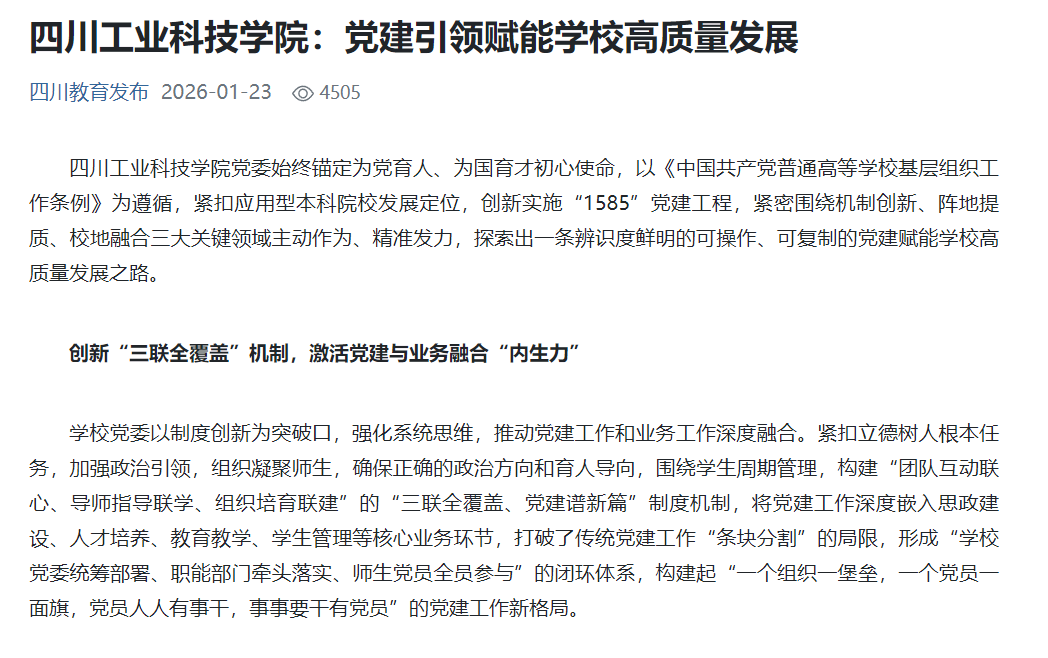 四川工業(yè)科技學(xué)院黨委始終錨定為黨育人、為國育才初心使命,以《中國共產(chǎn)黨普通高等學(xué)?;鶎咏M織工作條例》為遵循,緊扣應(yīng)用型本科院校發(fā)展定位,創(chuàng)新實(shí)施“1585”黨建工程,緊密圍繞機(jī)制創(chuàng)新、陣地提質(zhì)、校地融合三大關(guān)鍵領(lǐng)域主動作為、精準(zhǔn)發(fā)力,探索出一條辨識度鮮明的可操作、可復(fù)制的黨建賦能學(xué)校高質(zhì)量發(fā)展之路。