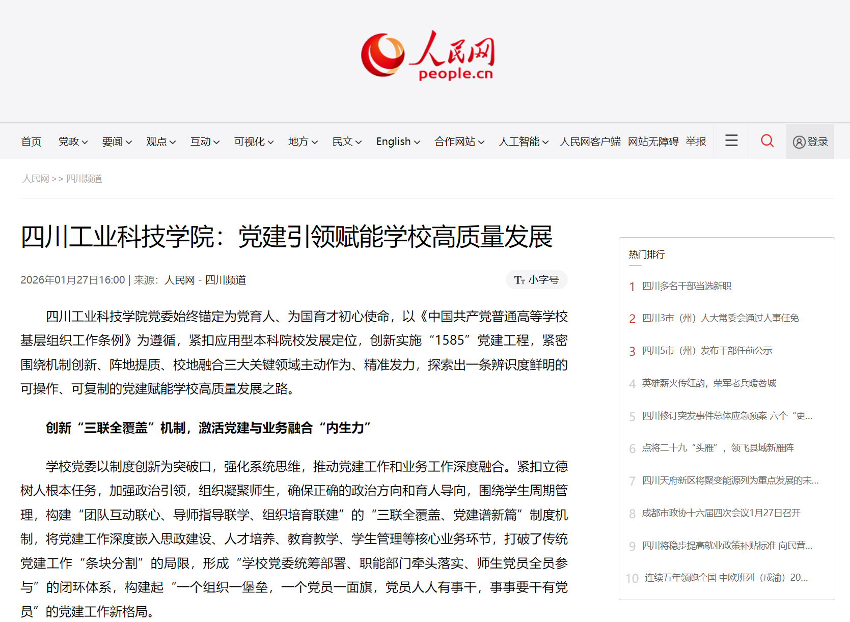 四川工業(yè)科技學院黨委始終錨定為黨育人、為國育才初心使命,以《中國共產(chǎn)黨普通高等學校基層組織工作條例》為遵循,緊扣應用型本科院校發(fā)展定位,創(chuàng)新實施“1585”黨建工程,緊密圍繞機制創(chuàng)新、陣地提質、校地融合三大關鍵領域主動作為、精準發(fā)力,探索出一條辨識度鮮明的可操作、可復制的黨建賦能學校高質量發(fā)展之路。