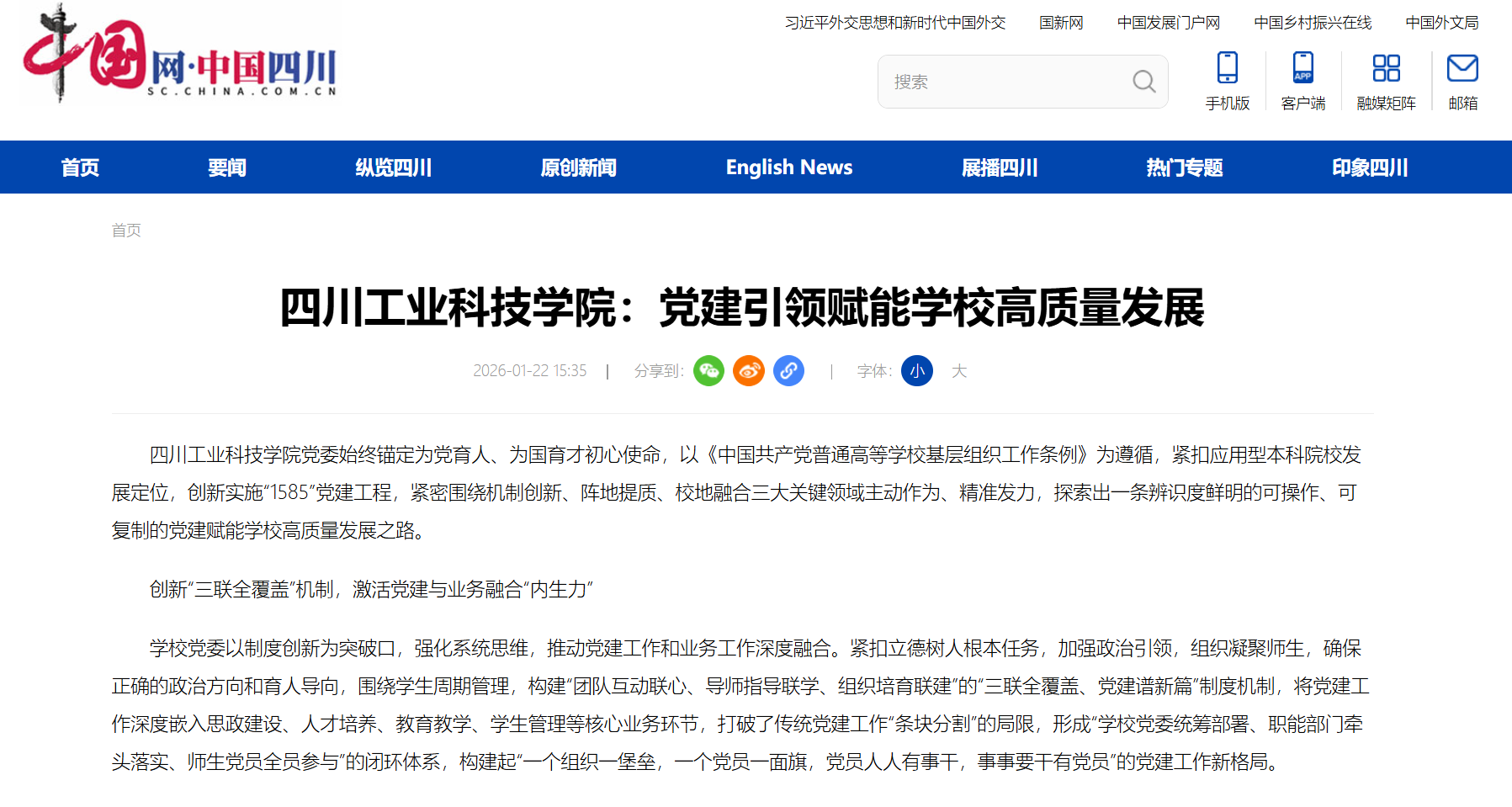 四川工業(yè)科技學院黨委始終錨定為黨育人、為國育才初心使命,以《中國共產黨普通高等學?;鶎咏M織工作條例》為遵循,緊扣應用型本科院校發(fā)展定位,創(chuàng)新實施“1585”黨建工程,緊密圍繞機制創(chuàng)新、陣地提質、校地融合三大關鍵領域主動作為、精準發(fā)力,探索出一條辨識度鮮明的可操作、可復制的黨建賦能學校高質量發(fā)展之路。
