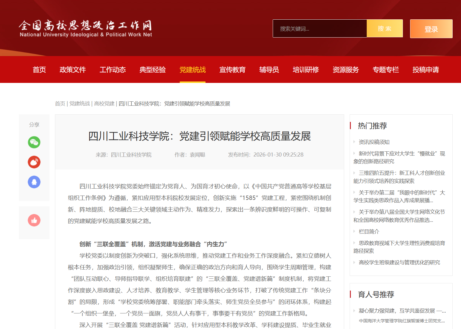 四川工業(yè)科技學院黨委始終錨定為黨育人、為國育才初心使命,以《中國共產(chǎn)黨普通高等學?;鶎咏M織工作條例》為遵循,緊扣應用型本科院校發(fā)展定位,創(chuàng)新實施“1585”黨建工程,緊密圍繞機制創(chuàng)新、陣地提質(zhì)、校地融合三大關(guān)鍵領(lǐng)域主動作為、精準發(fā)力,探索出一條辨識度鮮明的可操作、可復制的黨建賦能學校高質(zhì)量發(fā)展之路。