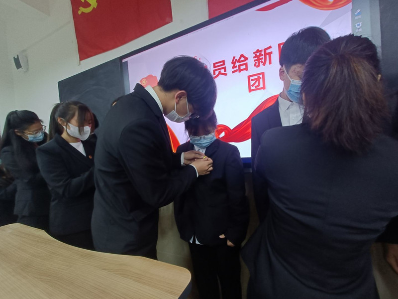 大會在莊嚴(yán)的國歌聲中拉開帷幕。會議伊始,由學(xué)工辦主任李丹宣讀了本次發(fā)展入團(tuán)人員名單。接著,由擬發(fā)展對象宣讀入團(tuán)志愿書、入團(tuán)介紹人宣讀介紹意見、在座團(tuán)員舉手表決,經(jīng)過層層篩選,最終確定7名新團(tuán)員。而后,由老團(tuán)員給新團(tuán)員佩戴團(tuán)徽并在團(tuán)旗下進(jìn)行了莊嚴(yán)的宣誓。大會最后,團(tuán)總支書記潘城妹帶領(lǐng)新老團(tuán)員明確團(tuán)員基本知識并對本次大會進(jìn)行了總結(jié)發(fā)言,對新團(tuán)員表示熱烈的祝賀和誠摯地歡迎的同時(shí),也對新老團(tuán)員提出了新的要求,她希望新團(tuán)員們能夠以入團(tuán)作為新的起點(diǎn),堅(jiān)定理想信念,牢記入團(tuán)誓言,用實(shí)際行動來詮釋誓詞,保持團(tuán)的先進(jìn)性,做一名優(yōu)秀的共青團(tuán)員。