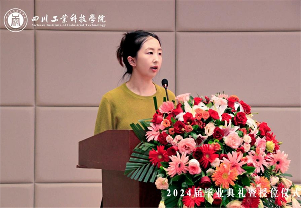 2024屆畢業(yè)班輔導(dǎo)員代表廖佳英老師發(fā)言。她為畢業(yè)生們送上祝福,并表達了對于學生未來的期待,未來是否繁花似錦,源自你們當下之努力。去做一個樂觀的人,保持開朗的心態(tài),永遠年輕,永遠熱淚盈眶;去做一個勇敢的人,勇敢面對人生每一個階段的不確定性和巨大機遇;去做一個堅定的人,翻山越嶺,事事竟成。衷心祝愿同學們一切順利,一路芳華,一生幸福。