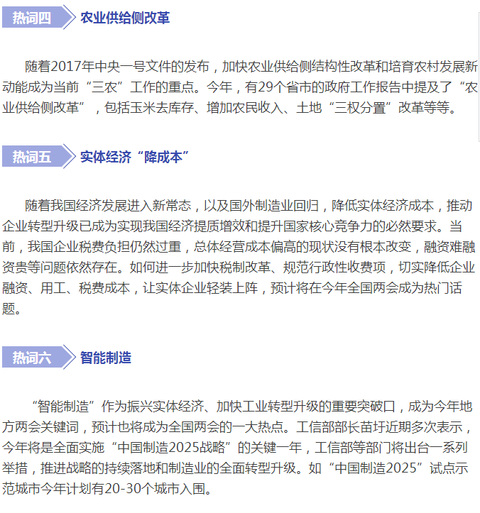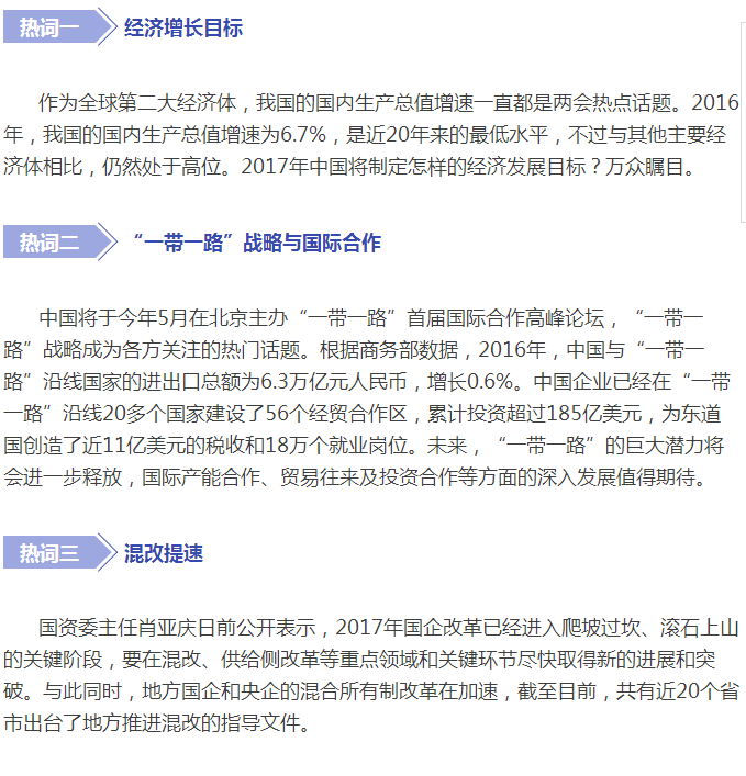 2017年是實(shí)施“十三五”規(guī)劃的重要一年,是供給側(cè)結(jié)構(gòu)性改革的深化之年。全國(guó)兩會(huì)“政經(jīng)熱詞”涉及今年國(guó)家政經(jīng)走向,所以備受關(guān)注。