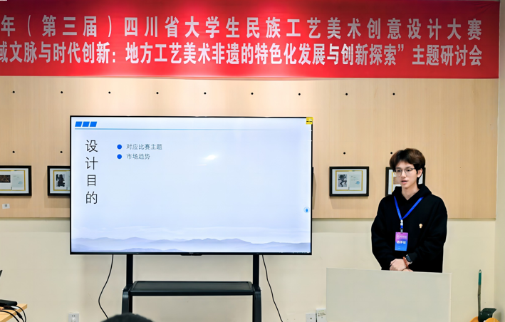 本次大賽校賽階段由信息工程學(xué)院非遺文化創(chuàng)新與品牌設(shè)計研究中心組織承辦,共征集作品160余件,經(jīng)遴選推薦65件參加省賽。經(jīng)評審,7件作品入圍決賽答辯環(huán)節(jié)。賽事期間,學(xué)校師生積極參與“非遺活態(tài)展示與體驗活動”,在羌繡代表性傳承人林福美指導(dǎo)下現(xiàn)場體驗傳統(tǒng)針法技藝,聆聽王宛奕博士“川西北非遺創(chuàng)新發(fā)展研究”專題講座,并參與民族工藝美術(shù)傳承與創(chuàng)新主題研討??敌览蠋熃Y(jié)合教學(xué)與創(chuàng)作實踐,在研討中作了交流發(fā)言。
