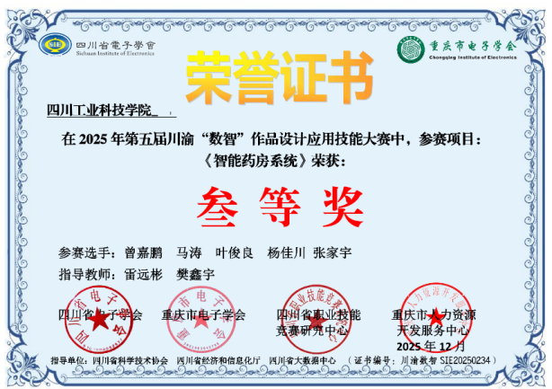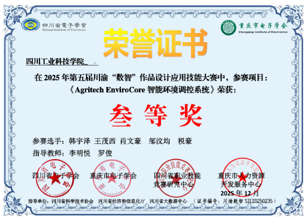 此外,由雷遠彬等老師指導,曾嘉鵬等同學完成的《智能藥房系統(tǒng)》與由李明悅、羅俊老師指導,韓宇澤等同學完成的《Agritech EnviroCore智能環(huán)境調(diào)控系統(tǒng)》兩個項目均獲三等獎。這些項目涵蓋了智慧醫(yī)療、智能農(nóng)業(yè)等多個“數(shù)智化”熱點領(lǐng)域,展現(xiàn)了學生們敏銳的技術(shù)洞察力和解決實際問題的能力。