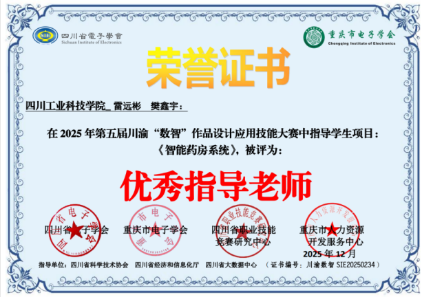 優(yōu)異的成績離不開指導教師的辛勤付出與專業(yè)引領(lǐng)。本次大賽中,雷遠彬、樊鑫宇教師團隊以及李明悅、羅俊教師團隊均被授予“優(yōu)秀指導老師”稱號,體現(xiàn)了學校教師在指導學生實踐創(chuàng)新方面的扎實能力。