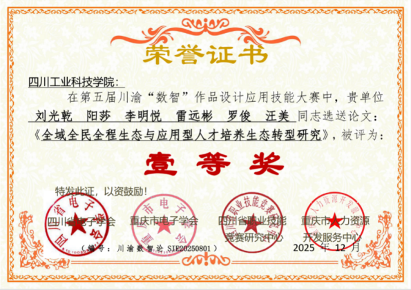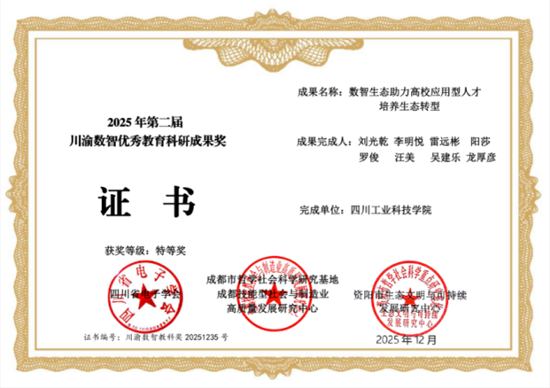 值得關(guān)注的是,依托大賽實踐開展的數(shù)智教育研究亦取得重要突破。由劉光乾、李明悅、雷遠彬、陽莎、羅俊、汪美、吳建樂、龍厚彥等老師共同完成的科研項目《數(shù)智生態(tài)助力高校應(yīng)用型人才培養(yǎng)生態(tài)轉(zhuǎn)型》,榮獲2025年第二屆川渝數(shù)智優(yōu)秀教育科研成果特等獎;由劉光乾、陽莎、李明悅、雷遠彬、羅俊、汪美等同志撰寫的相關(guān)論文《全域全民全程生態(tài)與應(yīng)用型人才培養(yǎng)生態(tài)轉(zhuǎn)型研究》榮獲大賽論文評選一等獎。這些成果表明,學校在“數(shù)智”領(lǐng)域的探索已從技術(shù)應(yīng)用延伸至人才培養(yǎng)生態(tài)的理論構(gòu)建,形成了實踐驅(qū)動、理論提升的良性發(fā)展格局。