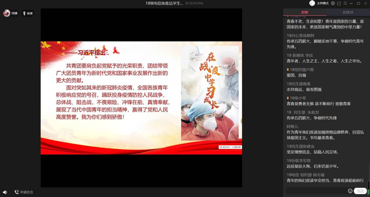 寄語一出,校團委第一時間組織發(fā)動全校廣大青年學(xué)生開展學(xué)習(xí)活動,要求各位二級學(xué)院分團委通過騰訊會議、QQ群討論等形式開展線上學(xué)習(xí)交流活動。全校9個學(xué)院、367個團支部、8700余名團員青年在線上進行了熱烈討論,深入學(xué)習(xí)領(lǐng)會了習(xí)近平總書記五四寄語精神。