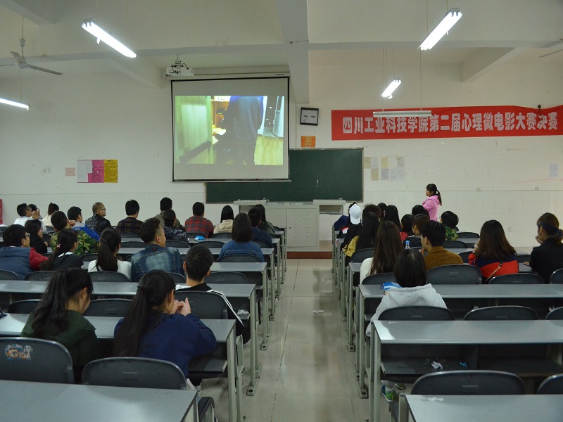 2016 年11月3日下午,四川工業(yè)科技學(xué)院第二屆心理微電影大賽決賽在毓秀104隆重舉行。大學(xué)生藝術(shù)團(tuán)副團(tuán)長(zhǎng)張彬老師、心理健康教育中心副主任蔡林老師、宣傳部王會(huì)杰老師、學(xué)生處劉俊秀老師、團(tuán)委曾曉莉老師、工商學(xué)院張東國(guó)老師擔(dān)任評(píng)委。各班心理委員以及心理協(xié)會(huì)成員100余人參加此次活動(dòng)。