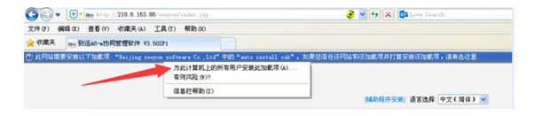 一、打開windows系統(tǒng)自帶的IE瀏覽器(務必),在地址欄輸入:校外:http://218.6.163.88:7201,校內(nèi):http://10.71.29.12,回車,鼠標點擊選擇地址欄下方彈出的加載項目,選擇為此計算機上的用戶安裝此加載項;