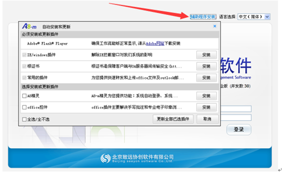 重新啟動IE瀏覽器,再次選擇輔助程序安裝,在彈出窗口選擇全選,并更新全部已選插件;